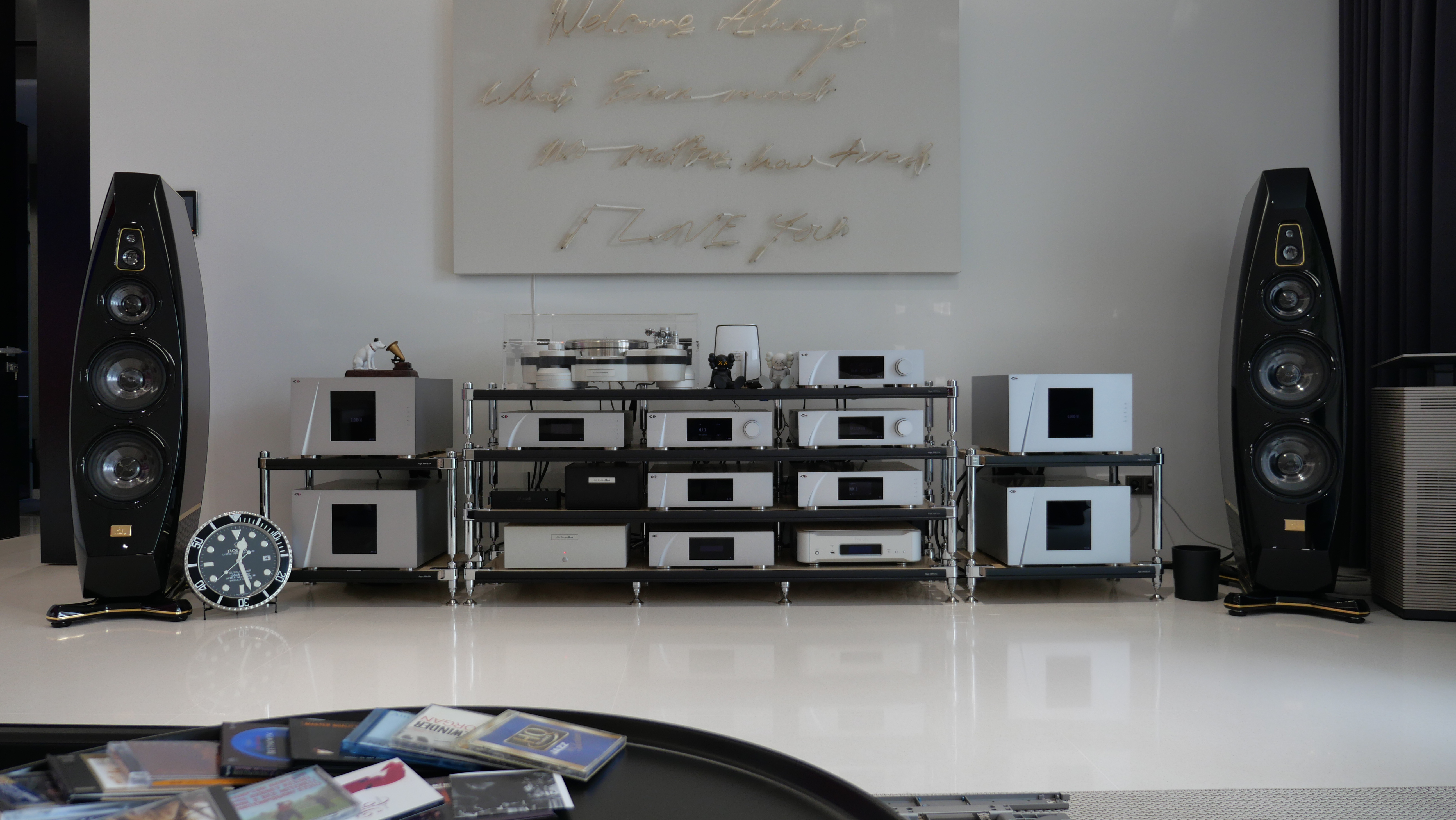 순백의 캔버스처럼 정갈하고 모던한 거실, 그 전면을 장식한 다정한 네온사인 조명 아래로 스위스의 정밀한 숨결과 네덜란드의 찬란한 예술성이 만났습니다. 그저 바라보는 것만으로도 가슴이 벅차오르는 압도적인 존재감, 지금부터 그 아름다운 조화를 소개합니다.